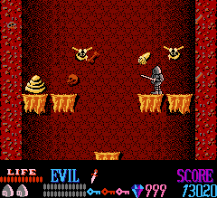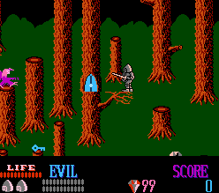 Wizards & Warriors, developed by Rare, was released in December of 1987 for the NES. The game stars Kuros, a powerful knight who enters the woods of Elrond in a quest to defeat the wizard Malkil. The game is depicted in 2D but has an open-world aspect to it, requiring that Kuros find a sufficient number of coins throughout the stage in order to proceed to the next. He can also acquire equipment that provides permanent boosts to various stats by finding the right keys and chests.