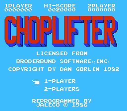 One of the earliest video games to have an exclaimed! title. While the original game and early licensed ports of Choplifter! have an exclamation point on the box art and/or title screen, later ports (notably Sega's) omitted it and subsequent games in the series followed suit.