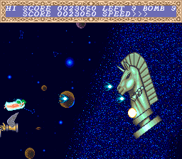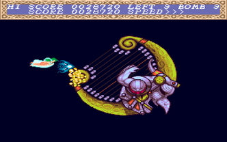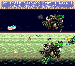 Like other representatives of the genre, Chō Aniki puts the player in control of a flying avatar that must clear out several levels of enemies while avoiding their firing patterns and attacks, as well as collecting power-ups that increase firepower, life, etc. The unique aspect of the game (much like Konami's Parodius games) are its often bizarre and deliberately nonsensical thematics. Idaten and Benten are the playable characters with different firing modes; other characters can aid them as options. Said characters include flying babies and laser shooting bodybuilders Samson and Adon. Enemies include flying heads and gigantic bodybuilders, as well as other examples of (usually very muscular) men fused with all sorts of machinery. The game features single player-only gameplay with three difficulty levels to choose from.