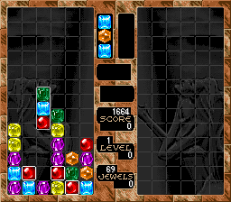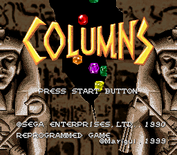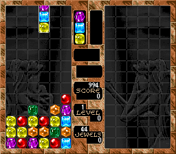 Columns is a Tetris-style puzzle game in which you stack falling jewels in order to created a chain of three of the same colored jewel.
