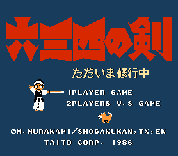 Musashi no Ken: Tadaima Shugyou Chuu ("Sword of Musashi: Currently in Training") is based on the Musashi no Ken manga and anime about a young but prodigious kendo student, Musashi, named for the legendary swordsman Musashi Miyamoto. It is one of Taito's earliest NES titles and the second to be made specifically for the system, rather than being a conversion of one of Taito's many successful Arcade games.
