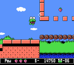 This video game has Sanrio's character searching for lost children who have been kidnapped by monsters. Essentially a standard Super Mario Bros. clone, the player controlling the cartoon frog has to leap around platforms jumping on baddies or killing them with his croak weapon. Each bonus level involves matching characters from the Sanrio franchise in a format similar to the card game Concentration. Intermission screens show the progress of the character throughout the game.