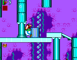 Besides the potions, other pick-ups include coins and money bags for points, chickens and chalices as health power-ups, a sickle for temporary invisibility, the Mega symbol for temporary super-strength and a red heart for an extra life. The game features a password system that allows restarting from any of the five main levels.