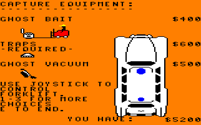 Most versions of the game had a similar basic format to the initial Commodore 64 and Atari 800 game, which Crane wrote in six weeks. He based it in part on an incomplete game called Car Wars featuring armed automobiles in a city; this led, for example, to the "ghost vacuum" on the Ecto-1, something not present in the film. Activision obtained the license early in the film's production, and most of the game was finished by the time Crane watched the film. While pleased with the game, Crane later stated that he regretted not being able to include a better victory screen. The last week of development was spent on the opening screen which plays the Ghostbusters theme. The game was later ported to the Spectrum, Amstrad CPC, and MSX.