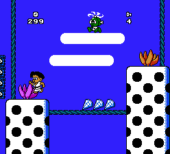 The game stars two characters, Koko and Suzi, who share the same abilities. You can either play as one of the characters in single player or both in multiplayer (the multiplayer mode is designed in a way similar to Super Mario Bros, i.e. the players need to complete each stage in turns). The A button is used to jump and the B button allows you to do a spin kick jump which can hit anything around you. In each level, you have to collect a required amount of keys under the time limit in order to beat it. Each stage is divided into 3 levels with a boss fight in the end. There are 5 stages in total and after completing them you need to beat all the bosses again before confronting the final boss. There are also question mark boxes around that you can break to get points, gems, a time increase, 1-ups or a power-up. The power-up can either grant you the ability to double jump and if you already have that, the ability to let you glide in the air. Koko Adventure was later changed and was supposed to be released by Innovation Technology in 1993 but due to unknown reasons, it never was along with some of Open Corp.'s other games. In this version, Suzi is replaced with a male character known as Waldog and the title screen was changed. (although her name remains on the game over screen through cheating/hacking). That version also features infinite lives, which was likely intended for debugging and testing.
