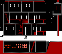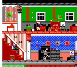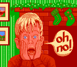 The premise of Home Alone for the NES is to survive 20 minutes against two burglars from the movie - the "Wet Bandits" Harry and Marv. Kevin can do this by hiding behind certain objects, or picking up trap blocks. The trap blocks represent a certain trap via a picture, but they all do the same thing: knock the pursuing burglar out for a short amount of time. Traps can be set anywhere in- or outside the house. After a few uses the traps break. The game also shows the player a map of where they set up traps, however it does not show where the burglars are. After 20 minutes are up the game cuts to an image of the robbers being taken away by the cops.