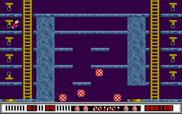The game centers around Seymour Greene, a plastics engineer at a beach ball company. There are two “critters” in his world: the good, red-and-white-checkered Boing! balls, which he is to collect for points, and the evil, black-and-green-checkered balls, which for some reason not explained by modern science, are ravenously hungry. For Seymour, his only defense is to find a large needle and poke a bad ball with it, after which the needle is ruined. |