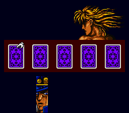 One of the earliest titles based on the anime series Jojo's Bizarre Adventures, this is a role-playing game with somewhat simplified mechanics and navigation system reminiscent of Japanese adventures. Combat is turn-based and is viewed from first-person perspective. Jojo and his party members possess the so-called "stands", super-powerful creatures they can summon during fights. Before each fight, the player has to choose one of five available tarot cards to determine the amount of luck and compatibility of the stands in the battle. Equipment and items can be bought in stores.
