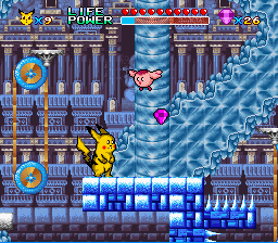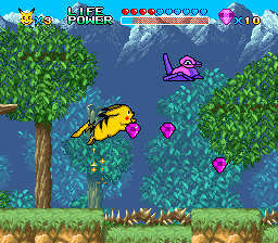 Like the Famicom pirate, the player controls Pikachu through numerous side-scrolling levels. There are 5 levels in total, with a boss at the end of each, as well as a mini-boss in the first level of the Mega Drive version. Pikachu can jump on enemies and uses a special move which clears all of the enemies on the screen, although the latter can only be done when the charge meter is full (indicated by a power bar at the top of the screen of the SNES version, or a numeric counter in the Mega Drive version, which is full when it hits 20.) The player can start either with 3 and 5 lives and continues each, and there's a difficulty setting in the options menu. A sequel to this game was made for the Mega Drive, Pocket Monster II. The ending is an image of some Pikachus.