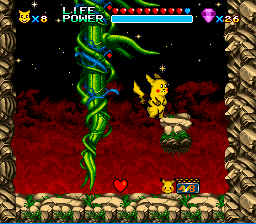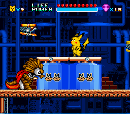 The graphics are ripped from numerous sources. The backgrounds are ripped from numerous Mega Drive games, including Tiny Toon Adventures: Buster's Hidden Treasure, Mr. Nutz, Quackshot, Magical Taruruuto-Kun, and Monster World IV. The graphics from the latter aren't present in the SNES version. The level graphics of the fourth and the last stage of the SNES version was ripped from Skyblazer. Some of the enemy sprites are ripped from Syd of Valis, and one of the enemy sprites appears to be taken from Super Metroid. The intro, as well as several other graphics, are taken from the Pokémon anime.