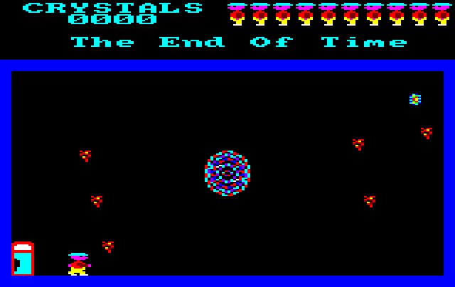 Poor Roland has been stranded on Earth by the evil Maestro. The crystals that power the special drive of his brand new Anti-Matter Space-Time Run-A-Round, have been scattered through Earth's past and future. Your task is to guide Roland through Earth's ages, searching for the crystals so that he can return home to confront his arch enemy. As you move from scene to scene, you must beware of the many creatures and objects out to destroy you. It will take all your skill and nerve, to search the 53 scenes in which the crystals are hidden. You are lucky enough to have regeneration tanks in your craft, but these can only be used 9 times. Good Luck! May the Lords of Time help you in your task!! — Cassette cover