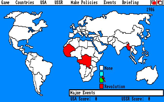 The year is 1986. You take on the role of the US President or the Russian General Secretary. You have the full industrial capacity, covert forces, and military might of your country at your command. Your job? To make your country the world's most powerful and prestigious over the course of your eight years in office. Sounds easy, doesn't it? It would be if the other guy didn't have his finger poised over a red button that could wipe out the world!