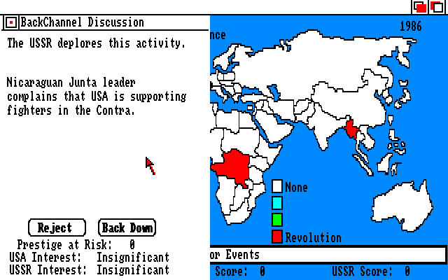 You must use diplomacy, make treaties, issue risky, covert CIA or KGB actions, or riskier, direct military intervention to prop up third world countries or help their insurgents and win them to your governmental philosophy: Capitalism or Communism. The world is a big place... and the other guy could start a nuclear war over a country as tiny as Tunisia. This game is the ultimate Cold War simulation. Every action requires careful analysis and the ability to judge your opponent (computer or human) and his reaction. The game features 62 countries, each carefully researched with up to date (as of 1985) information regarding their government, demographics, resources, etc.