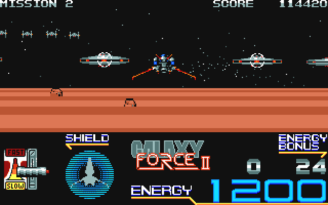 You are strapped into a spaceship to take on five dangerous settings, ranging from a pleasant garden to hostile fire and tough ice. You will have to fly freely before cutting through tunnels and canyons, and finally destroying an alien base. Your energy read out starts at 1200 and decreases as shots hit you, or you make contact with a wall or blockage. You have infinite cannons and guided missiles to help you along. You can get regular energy recharges and power upgrades, by shooting and then collecting their carrier pods.