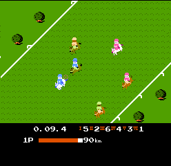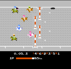 Family Jockey is a horse racing game for the Nintendo Famicom. You can choose between a one player or two player simultaneous mode. At the start you must choose a horse. Horses have different skill levels like speed, stamina or jump. During the race the horses and the course are displayed from a top-down view. You increase the speed of your horse by using your whip, which in return results in an energy decrease, so it must be used with care. There are two different surface types (lawn and dirt) and some courses have obstacles that you have to jump over. You must place at least in the top 4 of each race to continue with the game. Placing higher increases the prize money. Besides a mode that concentrates purely on the racing part you can choose a so called "Family Game" which includes a betting part in addition to the racing.