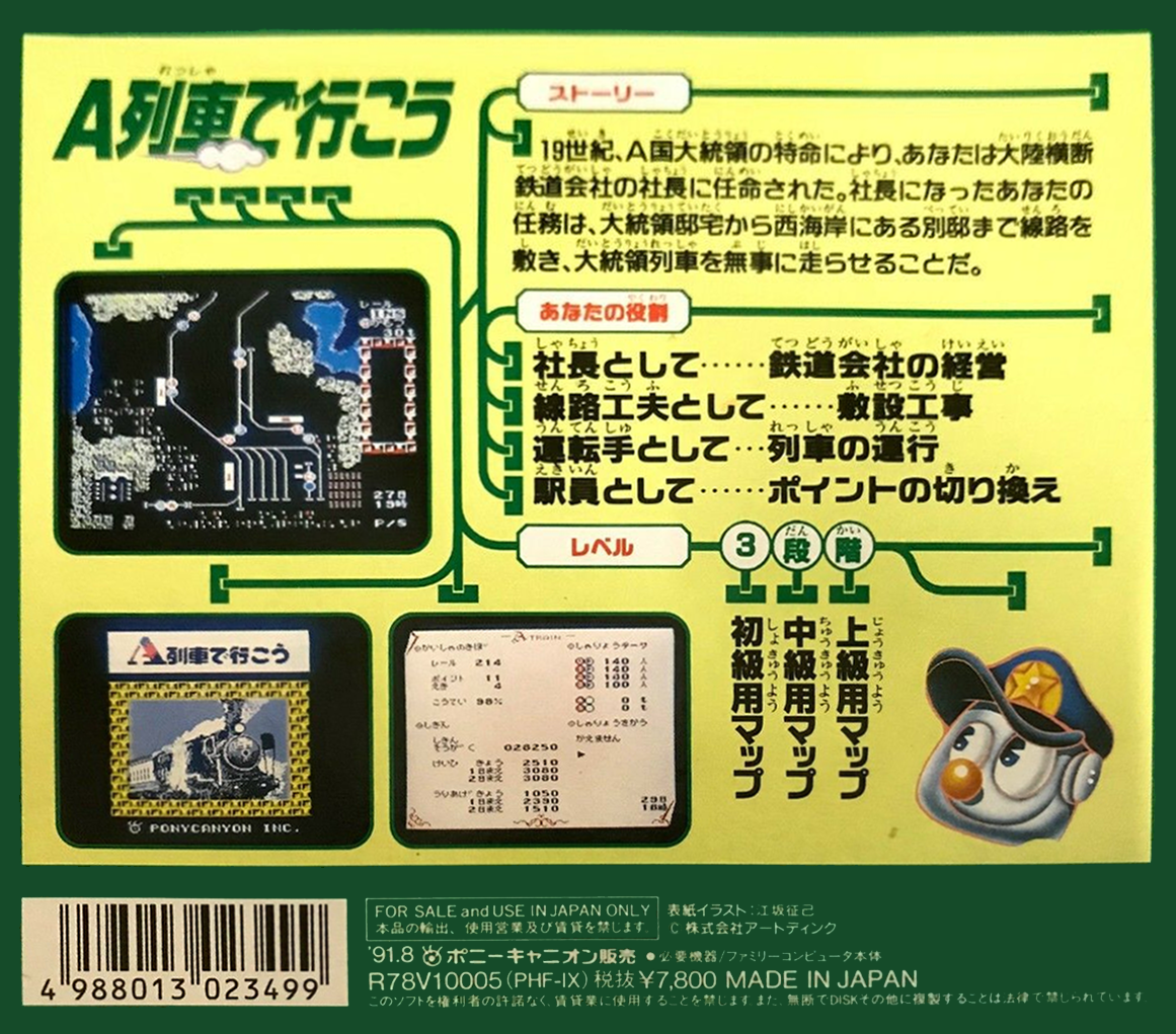 | __long_description | The first game in the A-Ressha de Ikou ("Let's Take the A-Train") series, which would eventually become known overseas as A-Train. The goal of the game is to build a prosperous railroad company. Unlike the second (Railroad Empire) and third (A-Train) games in the series, the original A-Ressha de Ikou never saw an international release.