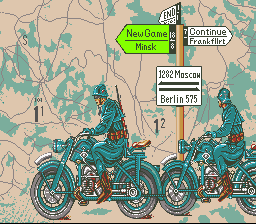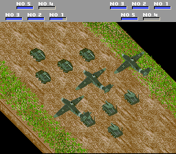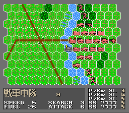 The game plays similarly to other strategy war-sims of the era, such as Famicom/Nintendo Wars or Military Madness (for instance, it uses a hexagonal spaces on the map). Each unit on the map - comprised of several instances of the same unit type - has their own stats concerning attack power, fuel consumption, maintenance costs and mobility. Whenever two units meet in combat, the view changes to present a dramatic enactment of the battle.
