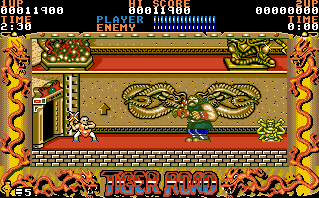 Tiger Road is a beat 'em up in which you (as Lee Wong) must rescue the village children from the evil Ryo Ken Oh. Many levels are horizontally scrolling, although with high ledges to jump onto and follow for a slightly different path. Magic urns containing improved weapons appear frequently. Most enemies are easy to attack and only need one hit to kill, although they come at you in large hordes. Once you get to the indoor sections you will find big enemies with the ability to kill you with one hit, in sections set on multiple levels complete with stairways.