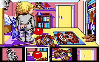 In the game the player takes control of a child protagonist called McGee and gets to explore his home. The house consists of a couple of rooms and in each room there are a few objects that can be interacted with. All interaction is done by clicking on the four different icons that appear in each room. When doing so a short animation will start and McGee will do something, for example play with a ball, take a bath or hide under the carpet. There is no specific objective to the game and the player can move around freely between the rooms and interact with things over and over again.