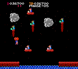 In Balloon Fight you need to fly around with the aid of two balloons and try to pop your opponent's balloons before they pop yours. Landing on top of your opponents will cause their balloons to pop and they will use a parachute to fall to safety. You then have to destroy the fallen opponents by running into them before they can blow a new balloon and rejoin the battle. Should both of your balloons get popped, you will fall into the water below and lose a life. There is also a second game variation called "balloon trip" where you need to collect as many balloons as possible while avoiding the ocean floor and lightnings that form maze-like walls.