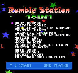 The Rumble Station is a NES-on-a-chip based Famiclone system that contained 15 games. It includes every NES game developed by Color Dreams, as well as two Sachen games published by them.