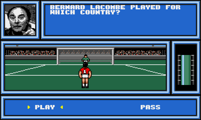 Saint and Greavsie is a sports trivia game where one to four players have to answer sport-related questions. Players start by throwing a ball across a series of stadiums. To the left of these stadiums is a green bar, and the higher the green bar, the greater the distance the ball will go.