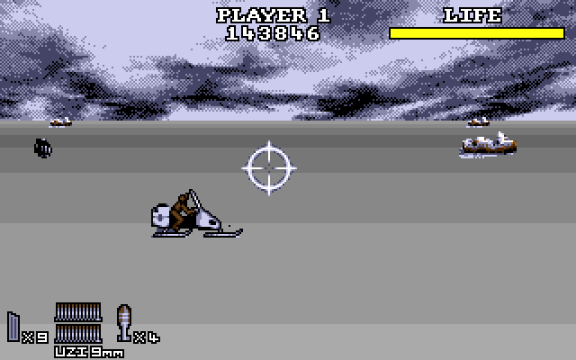 Based on the 1990 movie Die Hard 2, the program sends you through five stages modelled after key scenes of the film. As N.Y. cop John McClane, you have to shoot terrorists invading Washington’s Dulles airport by quickly aiming a crosshair at them. You’ll successively clear the luggage center, airport annexe and runway, then chase after the bad guys on a snowmobile and finally shoot it out on the wing of the terrorist’s plane. Each stage consists of three screens; on the last one, several tougher bosses will appear. Occasionally, civilians cross the room and pray that you don’t kill them. Most dying terrorists drop power-ups, namely med-kits, armour, grenades and weapons that are more powerful or fire faster. You collect these items by shooting them in time. If you do not aim fast enough, the terrorist’s bullets will drain your health; you may die three times, but after that, John McClane bites the dust once and for all. Until you restart, that is.