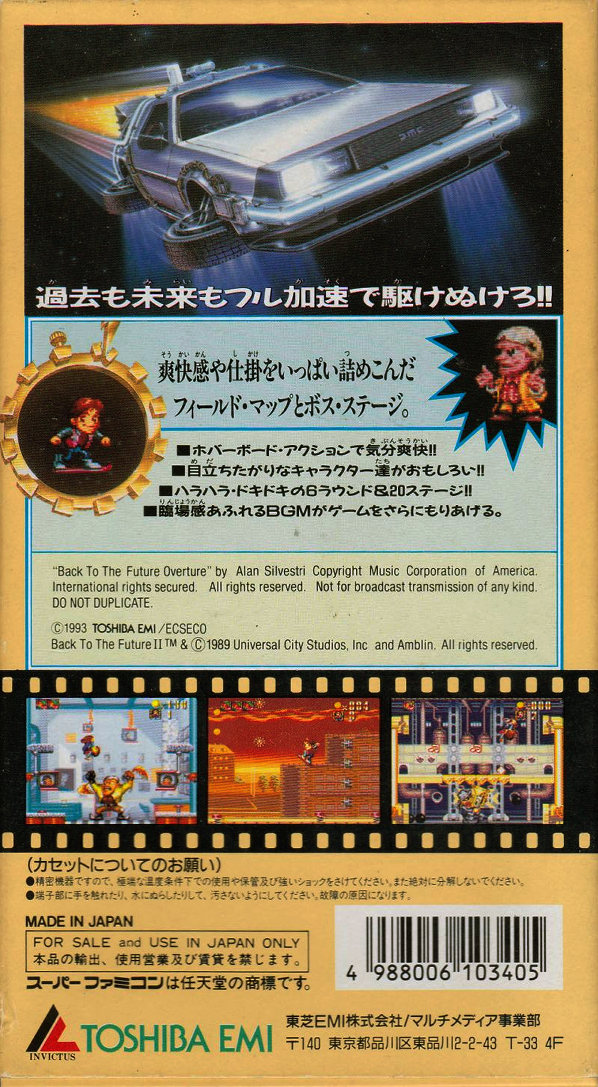 | description | A Japanese platformer game based on the second Back to the Future movie that was published by Toshiba-EMI for the Super Famicom. No official English version exists, but it does have a fan translation. |