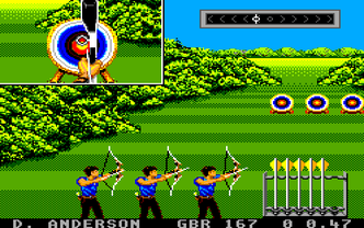 Gameplay features the typical button mashing formula used by Epyx during the 80s. 100M Sprint, 110M Hurdles and 200M Freestyle Swimming feature a button mashing sequence with just some changes: in the hurdles the player must hit the action key to jump over a hurdle (the timing sets the loss of speed) and in swimming, the sequence takes over one and an half minutes and the action button touches the edge for the return swim. In these events, the player initially faces a semi-final round and only qualifies for the final if ends in the top half. It's possible to watch the other semi-final. Hammer Throw combines a strong mashing sequence, along an accurate press of the action button to release the hammer, while Pole Vault combines an initial mashing sequence, a first tap on down to set the bar, then pressing up and the action button to release the pole and jump over the bar. Archery is a technical event where the player has three rounds with six arrows each, the winner being the one with the highest score on all three rounds.