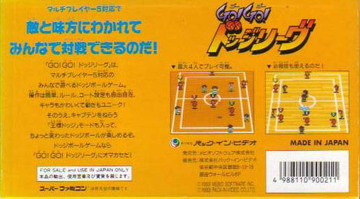 | __long_description | Go! Go! Dodge League is a dodgeball game for the Super Famicom put out by obscure Japanese developer Mebio Software and published by Pack-In-Video. The player can choose between several different teams, all with their own distinctive look, stage and special dodgeball attacks.