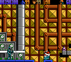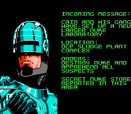 RoboCop 2 is a mission-based platform game. Missions have various objectives, such as destroying Nuke drug canisters or killing all the enemies. If you didn't destroy/kill enough, you'll be transported to a training mission, which is a first-person perspective shoot 'em up. Should you also fail the training, you must go to the beginning of the previous mission. Successfully completed mission or enough points scored by training allow you to proceed to the next stage. Unlike in the first RoboCop, there's no time limit, and you are able to jump.