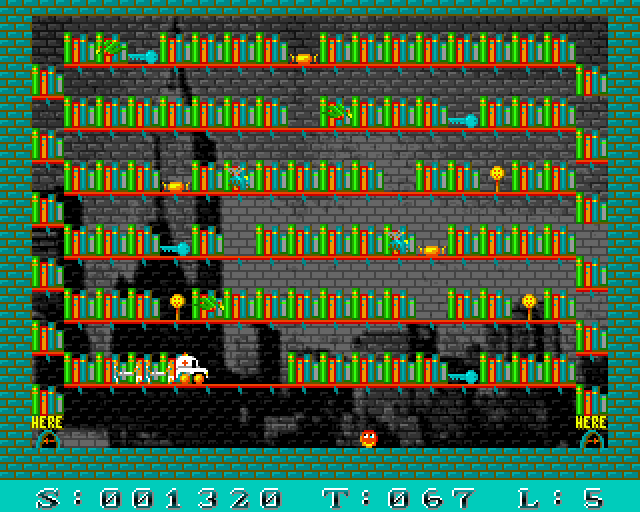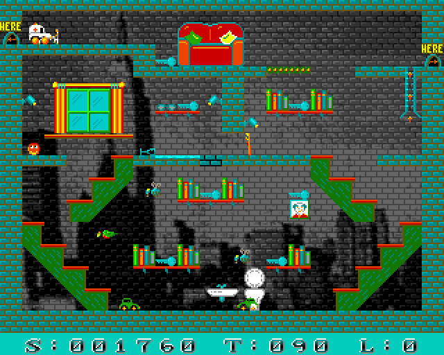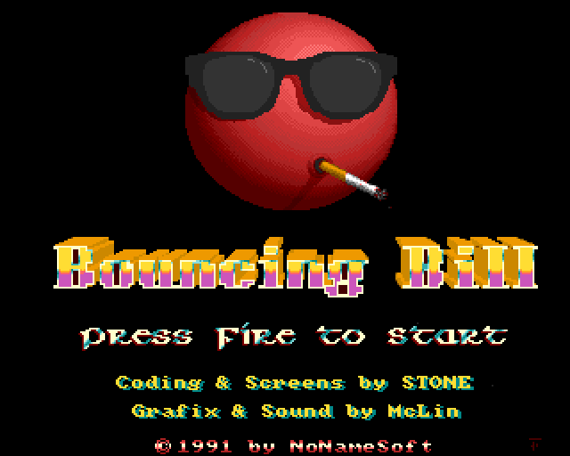 Bouncing Bill is a non-scrolling platformer in which the player controls a ball which moves through four scenarios (house, jungle, forest and space). The ball can roll or jump which is necessary to leap over gaps, collect items (e.g. keys) and avoid enemies which move through the screens on fixed paths. The screens are interconnected with exits and can be explored in a non-linear fashion. Running out of time, jumping too far down or touching an enemy results results in the loss of a life.