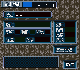 Super Baken Ou '95 ("Super Betting King '95", where "baken" specifically refers to horse betting) is a horse racing simulation game. Unlike its contemporaries, the game does away with the premise of the player raising their own racehorses and is instead a details-heavy predictive engine. The player inputs the data of horses taking part in upcoming races, storing the data of over 100 horses simultaneously, and uses that data to predict which will win.