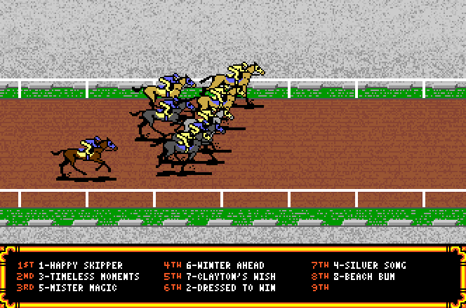 In Sport of Kings up to four human players can manage a successful horse racing stable. Choose which races to enter your horses into, and which jockeys to hire for them. Details of each horse and jockey's form, plus the conditions, should be used to help you make the right choices. After this, races are displayed from a side-view perspective.
