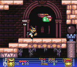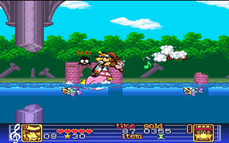 The game is typical platform. You play as Hamel, and with your violin can shoot musical notes to beat your enemies. However, you count with Flute’s aid. Flute follows you (although you can order her to stop and stay), but also can be grabbed and thrown at the enemies (yes, thrown at the enemies). Flute can also collect through all the stages some costumes that, when worn, give her special abilities, such as flying, leaping, breaking walls or even explode and kill all in screen. At the end of each stage, of course, you’ll find the typical boss, all named as musical instruments.
