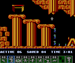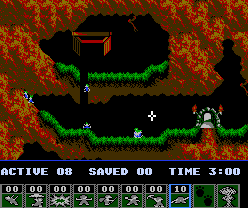 You are in control not of any individual Lemming, but of a cross-hair, which can be moved over any of the Lemmings. Along the bottom are a selection of functions which can be assigned to a Lemming, including climbing, floating and bashing. You must click to select the appropriate function, then click on the Lemming to activate it. Each level has a different range of skills on offer, a different amount of Lemmings, and a different percentage target in order to progress.