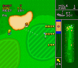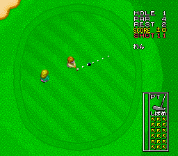 The player can select between Stroke Play, Match Play and Tournament, each of which takes progressively more time to complete. The game takes advantage of Mode 7 when presenting an overhead view of each hole before the player can tee off. It otherwise takes the common video game golf route of having the player hit the button to stop a moving gauge in order to determine how much power is behind the swing.