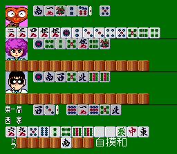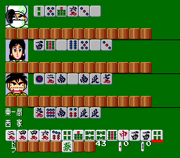 Gambler Jiko Chūshinha is a mahjong game based on Masayuki Katayama's manga of the same name. The game follows traditional mahjong rules with four participants, the player competing against three AI-controlled opponents. There is a tournament mode that can be saved, and a free mode in which the player controls the manga's protagonist and competes against any combination of the 36 available characters.