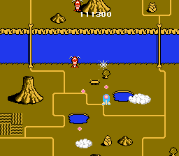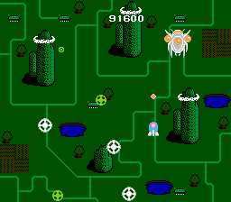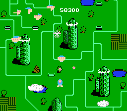 Power-ups in the form of bells can be collected by shooting clouds. The color of the bell will change if it is shot by the player, assuming one of the possible colors: