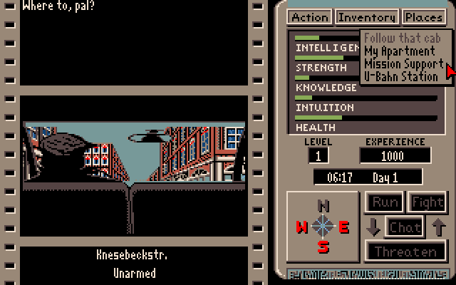 You start off in your apartment, which contains a computer, bugging equipment and an answerphone, as well as useful items such as money and a passport. A compass on screen is used to move around, with symbols appearing on the left and right of the status screen to indicate when something important is to the west or east of you.