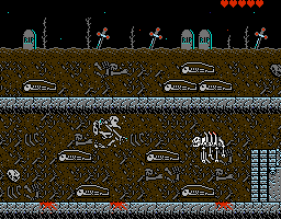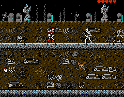 Robodemons tells the tale of Kull, demon king of the Hades underworld. Kull conquered the earth by using a special machine to transplant demon souls into robots. You are a brave warrior who has accepted the challenge of rectifying this situation. Using only a boomerang for offense, the hero descends into the depths of the underworld. The game begins with a flying/shooting side scrolling level and then proceeds to walking/jumping side scrolling action. All kinds of undead creatures (mostly skeletons) are waiting to destroy you.