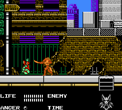 You start the game in human form. The human can punch, jump, move and shoot a powered up shot which moves horizontally across the screen. By finding a Red "W" icon, the human is able to transform into a mighty werewolf creature. Accidentally grabbing a blue "W" icon or losing too much energy will change you back into a mere human being. The werewolf form offers higher jumps, quicker speed, greater strength, a shockwave attack and the ability to climb walls, so naturally you'll want this form whenever possible. Additionally the werewolf form has an anger meter that is augmented by collecting orbs. After 5 such orbs, the werewolf will transform yet again into a SUPER werewolf with even greater strength, speed and partial invincibility.
