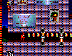 The Flash is a side-scrolling platformer starring the eponymous D.C. comics hero. The game is divided into six rounds, each round has two stages and a boss fight. Within each stage, Flash must get to the exit before the time limit runs out, though the exit must first be unlocked by activating a switch.