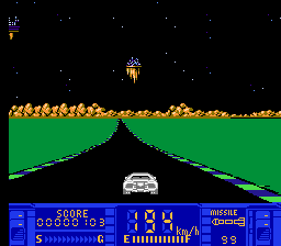 In this racing game, you drive your car on the highway through pseudo-3D environments. The opponents will not hesitate to push you outside the road. You can either squeeze between them (pressing the Down button will make your car smaller), or shoot at them with a limited amount of missiles. On the way there will be shops where you'll be able to repair and upgrade your car.