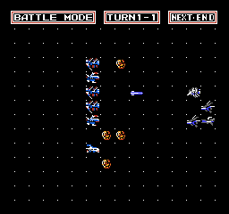 While flying around sometimes enemy spaceships will be spotted. The player can ignore them or choose to enter a turn based battle with them. During the battle, players choose where to place their fleet on a square grid map. The player's fleet and the enemy fleet take turns volleying shots at each other. The victor of the battle is whoever still has remaining spaceships in their fleet.
