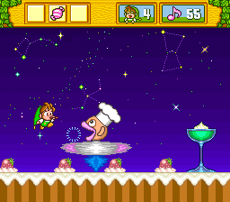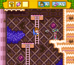 By collecting 100 music notes, Milon will get an extra life. There are also other useful items to get like bubble gum that will save Milon once if he were to fall, a special bubble shooter that let's him shoot multiple bubbles at once and a star that makes Milon temporarily invincible so that he can defeat enemies simply by running at them.