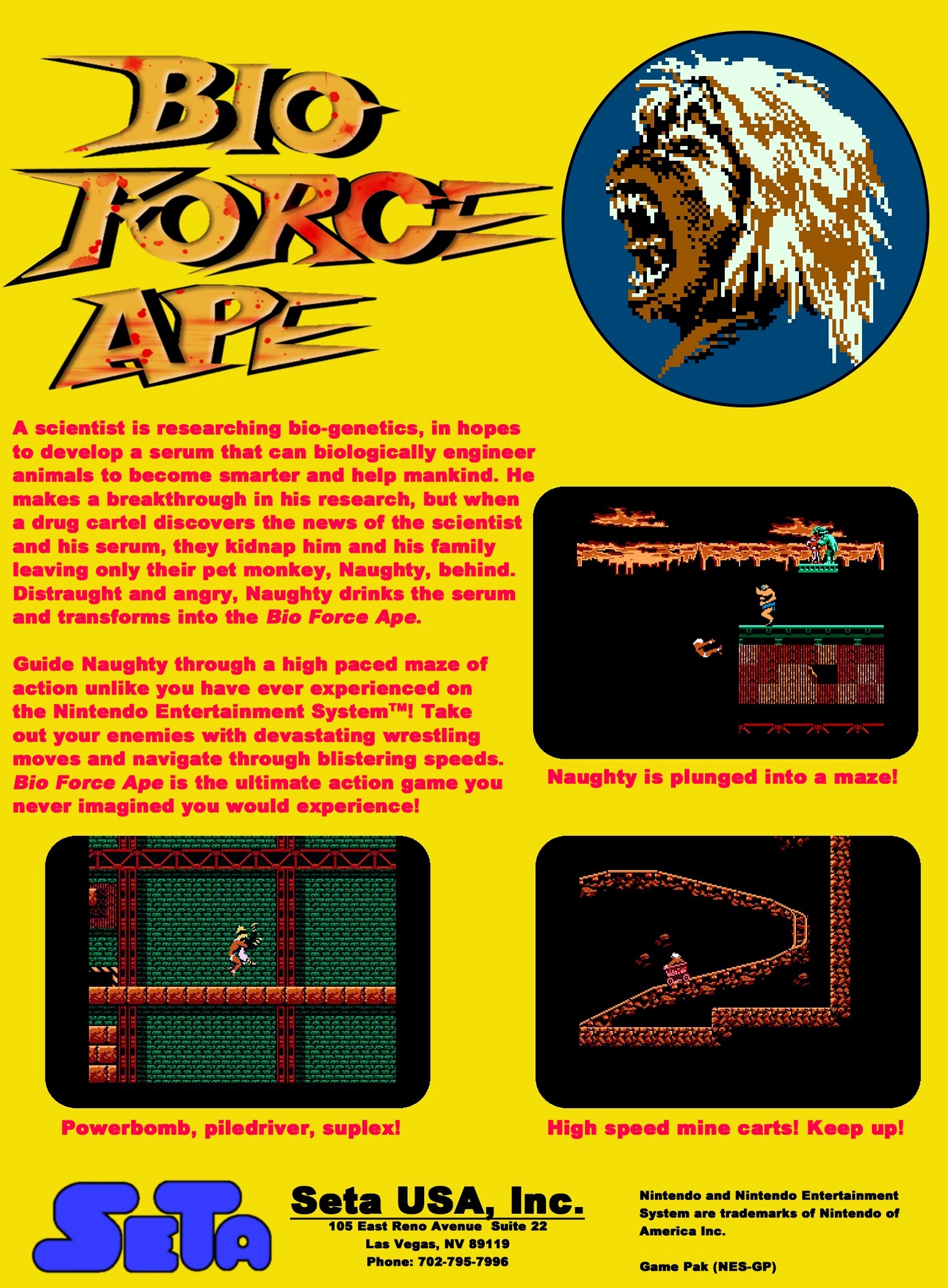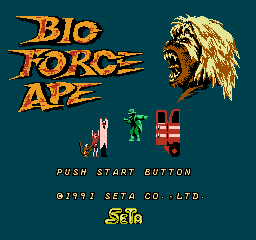 | __long_description | Bio Force Ape is an unreleased NES title that was in development at SETA before its cancellation. The game is an action platformer that puts the player in the role of a primate infused with power that makes him more humanoid and imparts him with superhuman strength. It was profiled in a preview article in the the August 1991 issue of Nintendo Power, but it was subsequently announced that the game was cancelled in the April 1992 issue. |