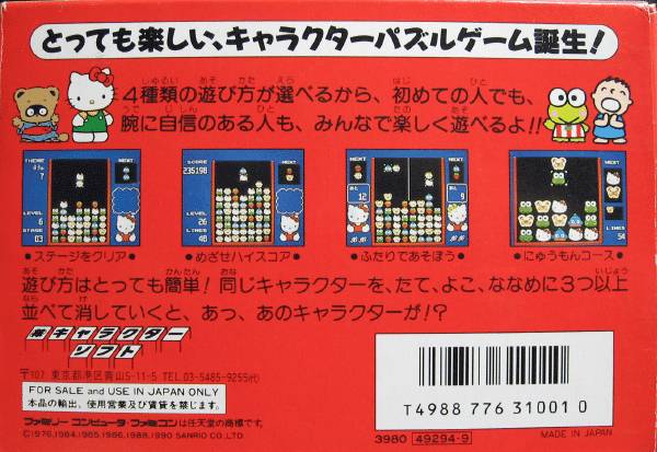 | description | Sanrio Carnival is a Famicom and Game Boy puzzle game starring characters from the Sanrio line of merchandise. |
