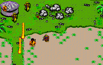 A vertical-scrolling shooter in the tradition of Commando, Ikari Warriors, and Guerrilla War. Rambo and his buddy Zane (who didn't appear in the movie) are charged with blasting their way through various levels and rescuing the hostages. Of course, it won't be easy — soldiers, tanks, and other enemies will do everything they can to stop you from saving the day. Unlike Ocean's later First Blood License, a single hit kills you, and your weapon is a gun rather than knives.