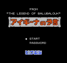Aigiina no Yogen ("Aigiina's Prophecy") is an action/platformer developed and published by Japanese communications technology giant Vic Tokai and is the first of many games created by the company for the Nintendo Entertainment System. It is the spiritual sequel of an Arcade game named Balubalouk no Densetsu ("Legend of Balubalouk"), which is what the subtitle refers to.